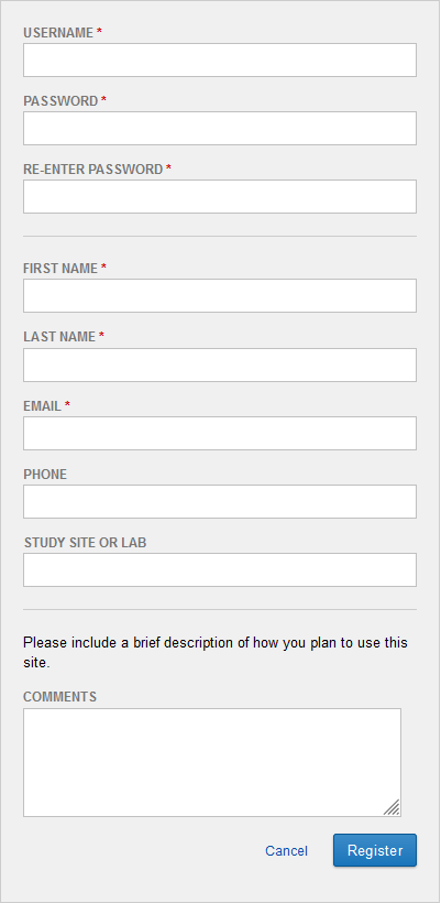 In a standard XNAT installation, user accounts must be created by either the user themselves or by the site administrator. Users will be given the option of registering for an account when they first visit the site. At UAB, navigate to xnat.rc.uab.edu/xnat and click Register on the home page. The following registration page will appear