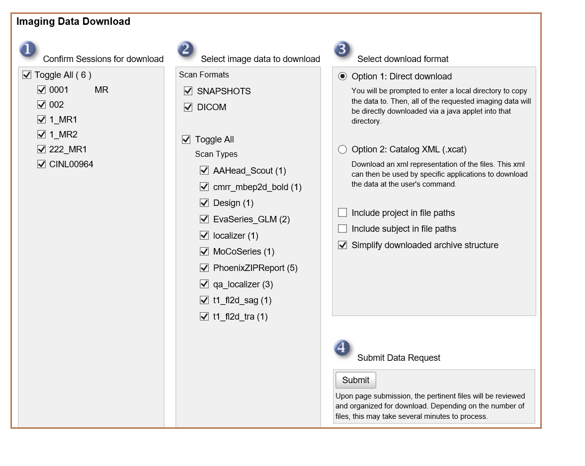 The next page allows you to select imaging sessions and scan types you would like to download. Click Submit.